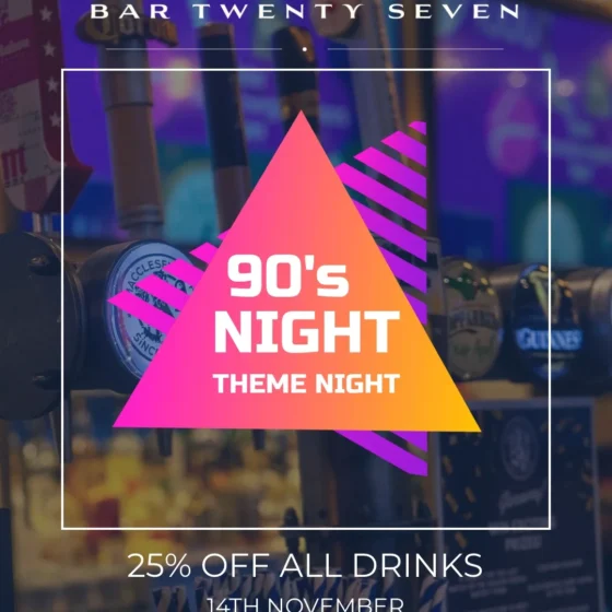 Join us for an epic night of nostalgia at our 90’s themed night on Friday 14th November in Bar Twenty Seven. Entry is free for all fancying a boogie to the decade’s best tunes throughout the night. There’s 25% off all drinks, catering to everyone’s tipple of choice. See you there!
